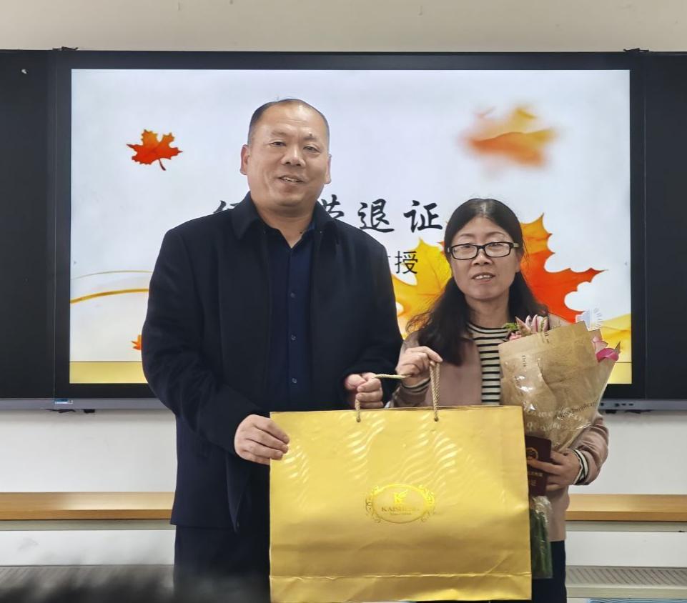 院长王保成为王乐红老师颁发退休证,并代表全院师生赠送鲜花和纪念品。